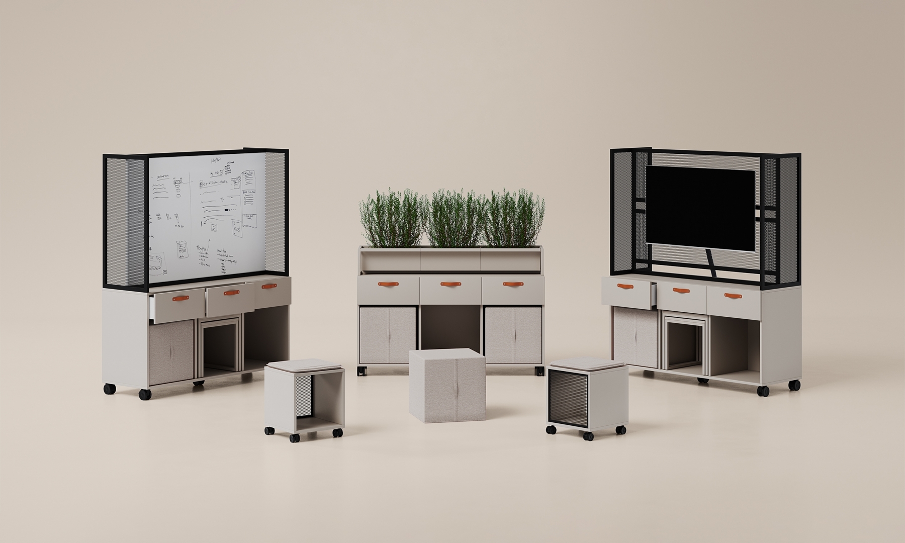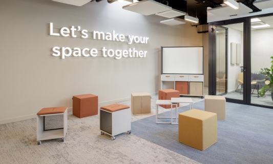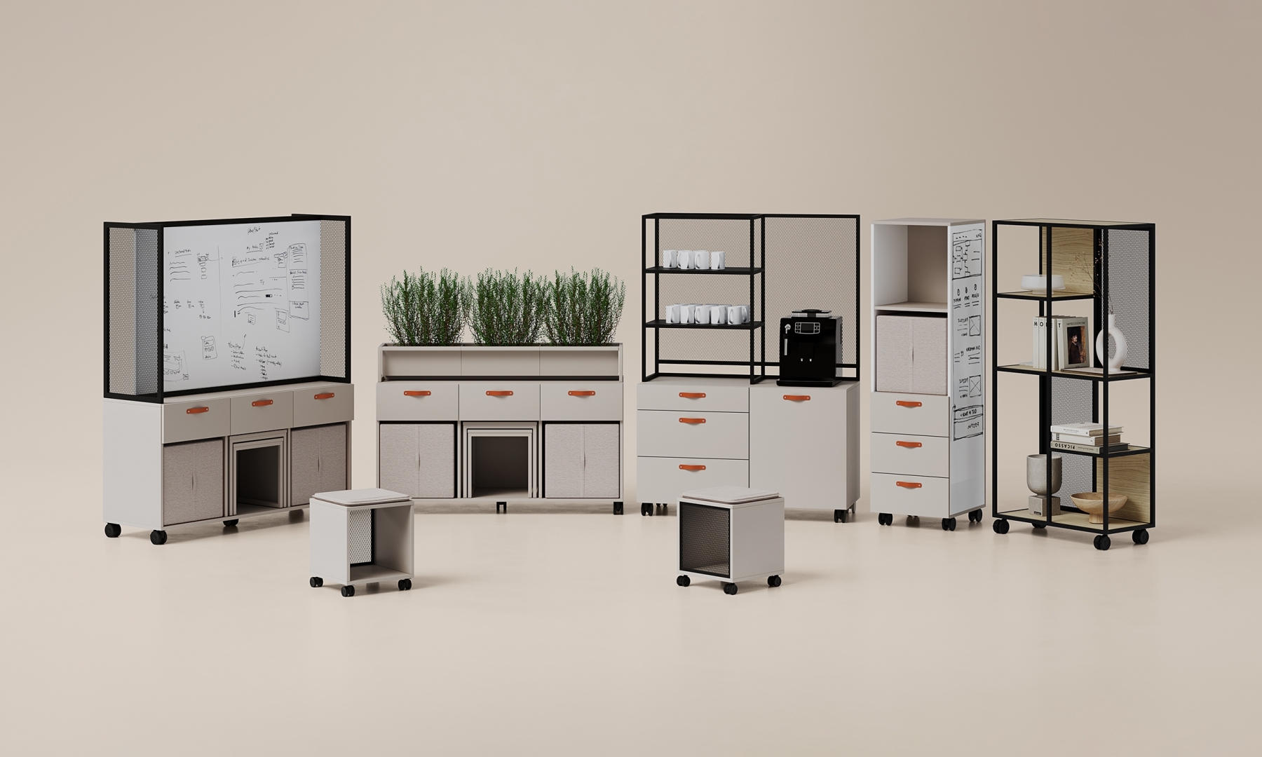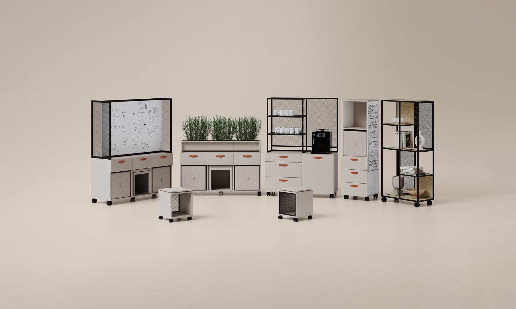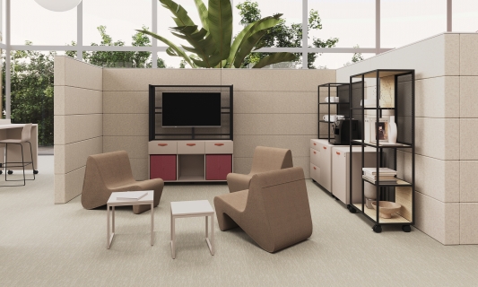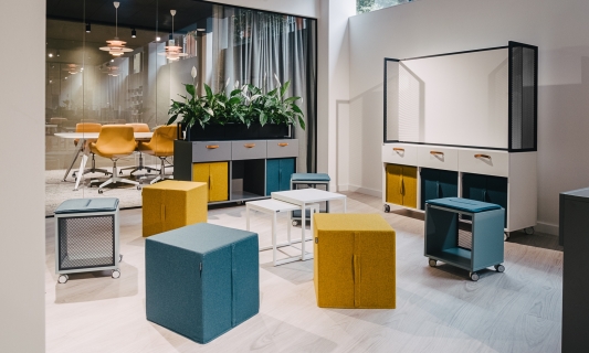 Offa is a furniture line that consists of over dozen of models that enable building flexible agile-based workspace. All pieces are mobile so the office gets adaptable and responsive to changing needs of collaborative teams. Multifunctional sideboards, cabinets and high tables accompanied with pouffes, side tables and whiteboards create a complex solution for dynamically changing work environment.